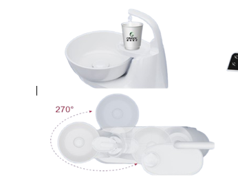 Cuspideira removível em cerâmica, com mecanismo de rotação a 270°. Quando o copo é colocado sob o bocal, o enchimento é efectuado automaticamente.